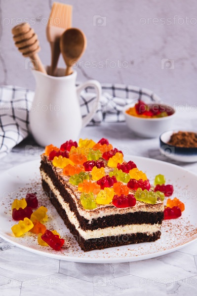 Шоколадный торт, украшенный переваривающимися медведями на тарелке на столе с вертикальным видом