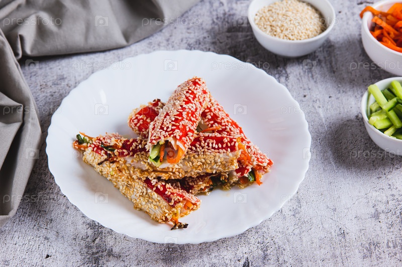 Жареные крабовые роллы с огурцом и морковью в кунжутных семенах на тарелке за столом