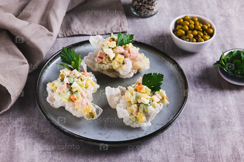 Оливковый салат в рисовых бумажных мисках на тарелке на столе