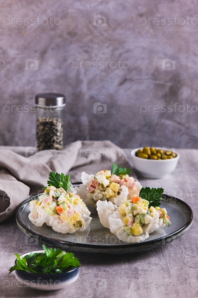 Частичный салат Оливье творчески подается на тарелке на столе с вертикальным видом