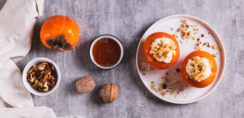 Сладкий персимон, наполненный творогом и грецкими орехами на тарелке с веб-баннером для верхнего просмотра