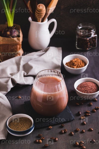 Кофе со специями и какао-порошок в стакане на столе вертикальный вид