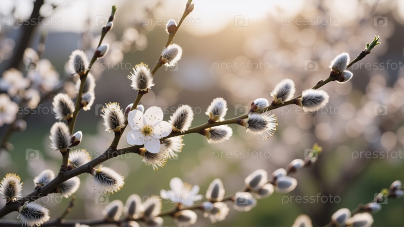 Близкий план мягких, пушистых тюленей ивы и нежного белого цветка на ветке дерева, освещенного теплым солнечным светом, что означает приход весны