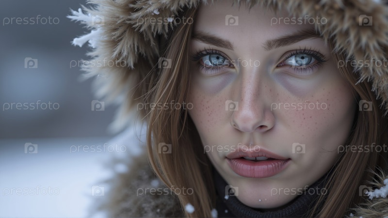 Молодая женщина с длинными коричневыми волосами в меховом зимнем пальто на открытом воздухе в снежную холодную погоду крупный план