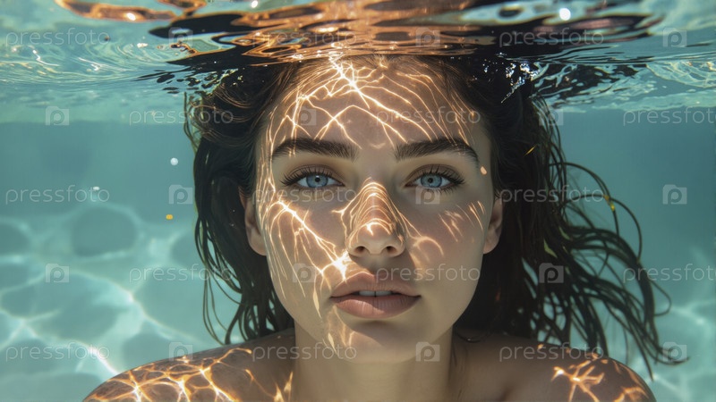 Молодая женщина под водой в солнечном бассейне с волнистыми волосами и отражениями на лице и плечах
