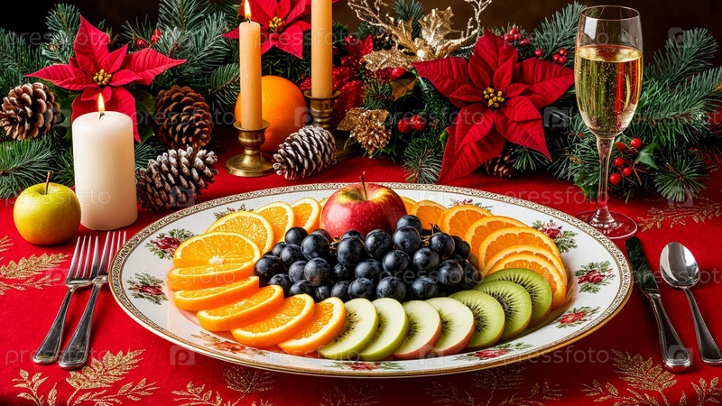 Праздничный новогодний стол, нарезание фруктов на красной скатерти, стакан шампанского