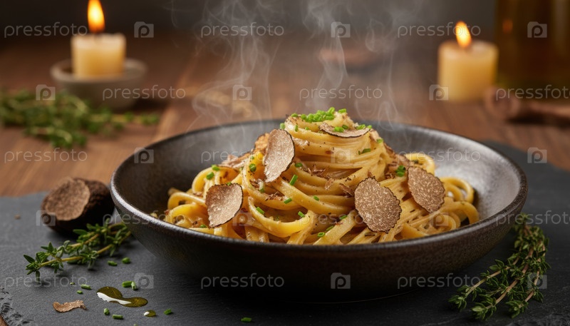 Трюфельная паста подается тепло в деревенской обстановке, символизируя изысканную кухню и элегантный кулинарный тренд во время уютной вечерней трапезы
