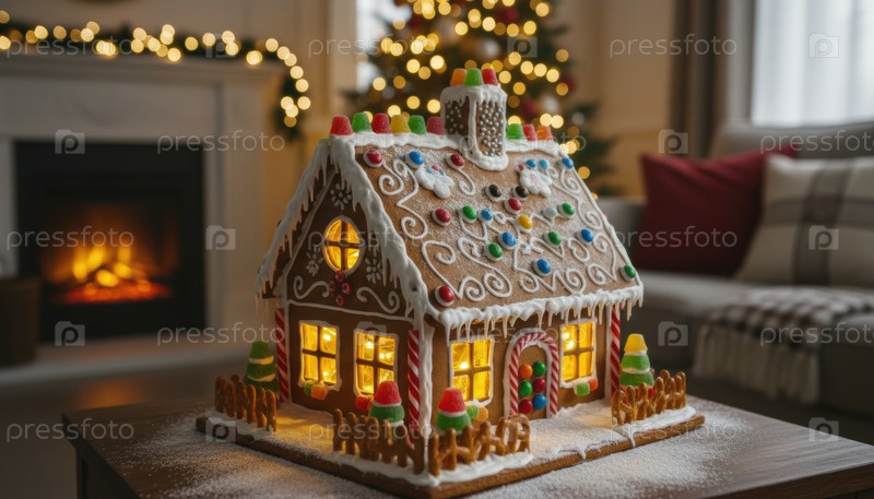 Дом из пряников загорелся в уютной комнате, захватывая праздничный дух и традицию праздничного ремесла во время зимних торжеств