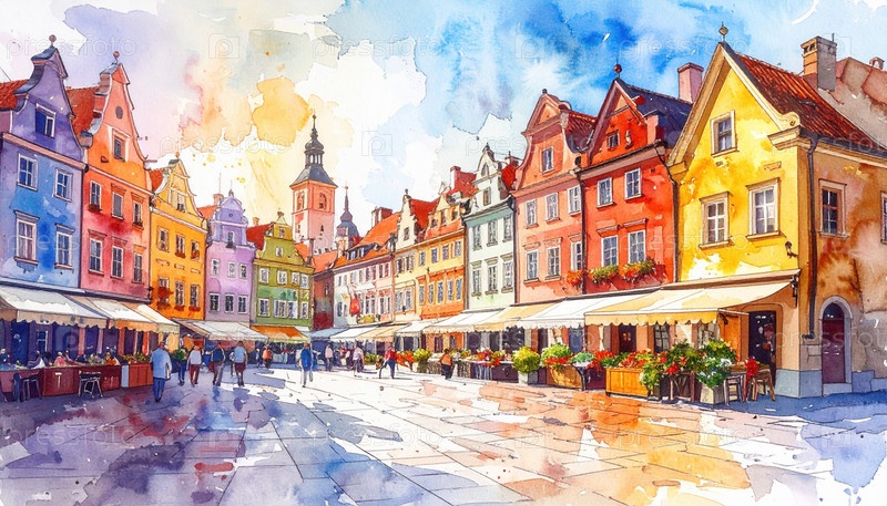 Красочная историческая городская площадь в Европе с людьми, гуляющими между кафе и домами, представляет собой веселую атмосферу культурного туризма и летних каникул