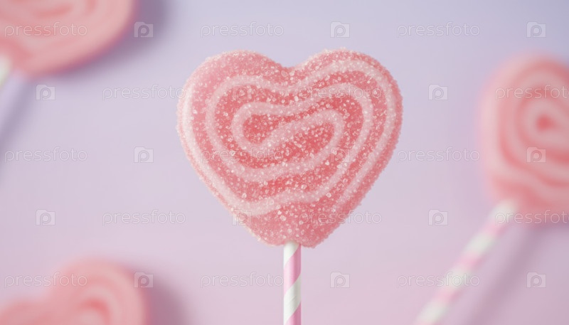 Розовый сахарный леденец в форме сердца на пастельном фоне, игривый символ романтики Дня святого Валентина, сладкой привязанности, детской ностальгии и эстетики социальных сетей