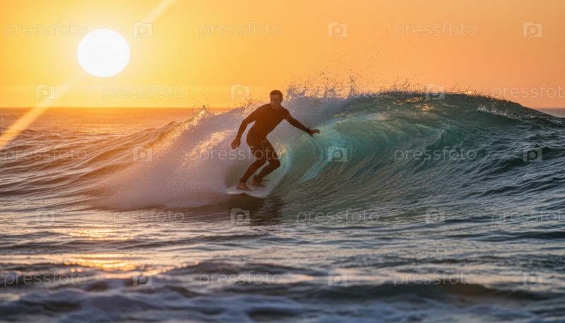 Сёрфер, катающийся на океанской волне при закате солнца, захватывает дух свободы, равновесия и связи с природой, представляя вдохновение для путешествий, приключений и сущность летней энергии