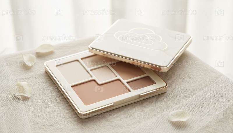 Палитра косметического макияжа с теплыми нейтральными оттенками и обложкой облачного логотипа опирается на текстурированную поверхность льняного полотна с листьями белых роз