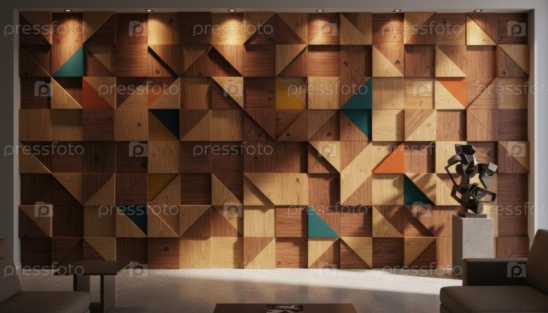 Современный зал с большим геометрическим деревянным элементом стен и скульптур, демонстрирующим устойчивый дизайн интерьера, эстетику творческого пространства и современное домашнее оформление