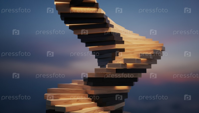 Спиральная башня из освещенных деревянных блоков на тёмном небе, художественная метафора дна, устойчивая архитектура, инновации, рост и футуристическое видение