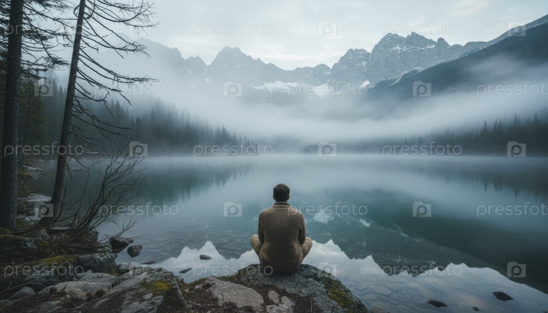 Человек сидит тихо у туманного горного озера, отражая мирное одиночество сознания и связи с природой в спокойное утро, окруженное альпийской пустыней и туманом