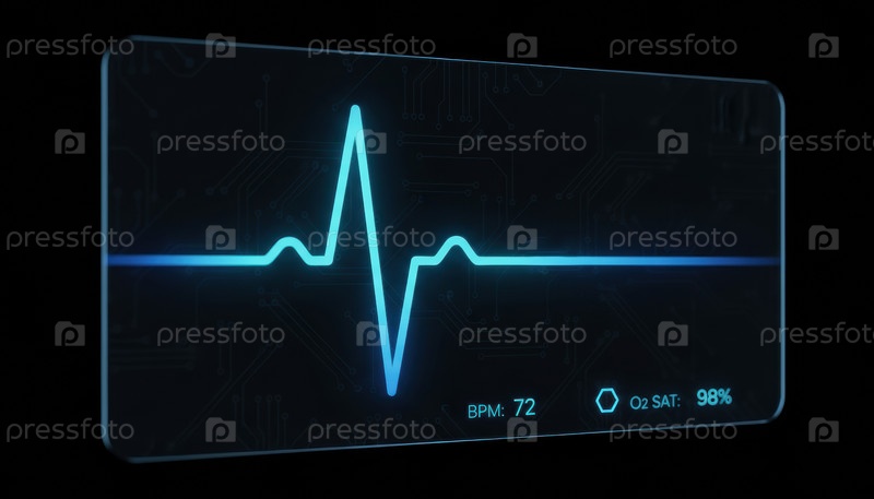 На футуристическом мониторе отображается ярко-синяя неонная линия сердечного ритма, показывающая волну пульса и ключевые жизненно важные признаки, такие как BPM и насыщение кислородом