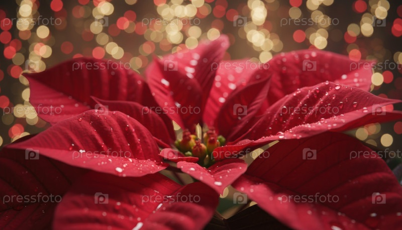 Цветок пуенсетсии с праздничными огнями, символизирующими рождественские каникулы, традиции зимнего украшения и теплую сезонную атмосферу