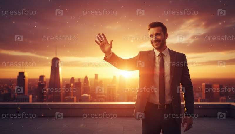 Бизнес-лидер размахивает на крыше при закате, символизируя оптимизм, инновации и продвинутое видение городского развития и современной корпоративной культуры