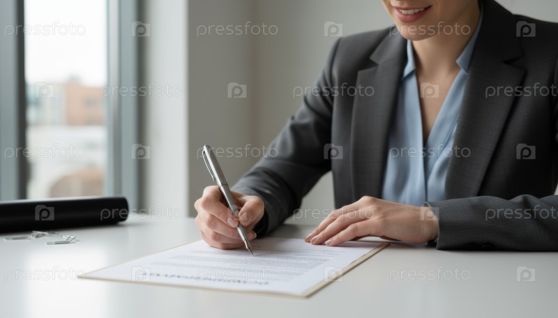 Уверенная в себе деловая женщина подписывает новый договор о партнерстве за офисным столом, символизируя доверие, возможности и начало сотрудничества