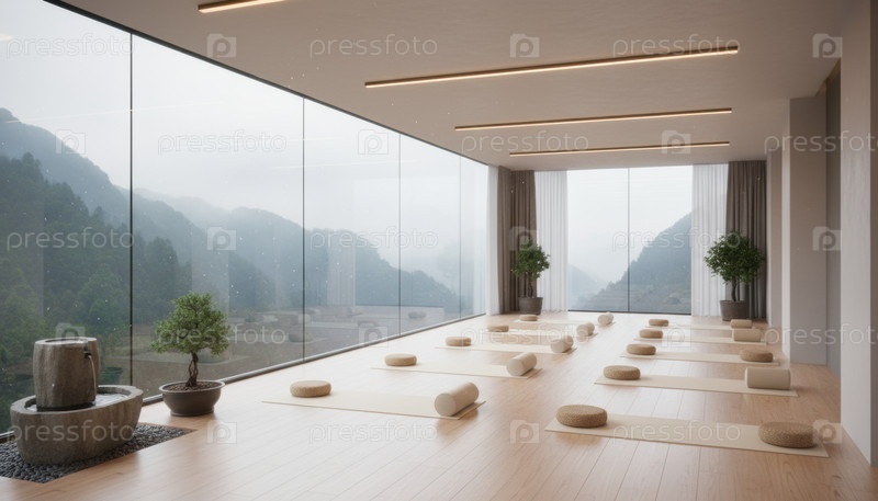 Медитационная студия с видом на туманные горы, символизирующая спокойствие на пути и современные тенденции целостного образа жизни