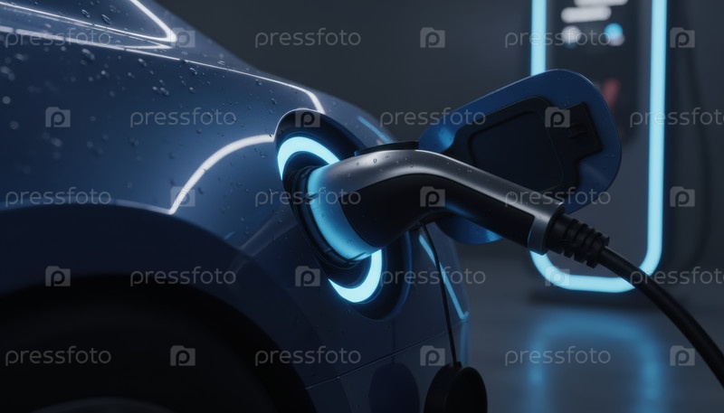Закрытие синей зарядки электромобиля на ночной станции - символ зеленой мобильности, перехода к чистой энергии и будущего городского движения