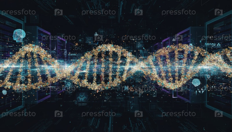 Светящаяся двойная спираль ДНК из частиц данных, плавающих в темной комнате сервера, концептуальный образ для геномики, больших данных и будущих медицинских исследований
