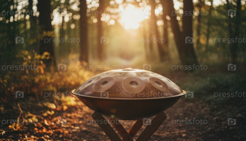 Ручно изготовленный инструмент в солнечном лесу, представляющий собой музыкальное творчество, расслабление и сознательный отдых на свежем воздухе