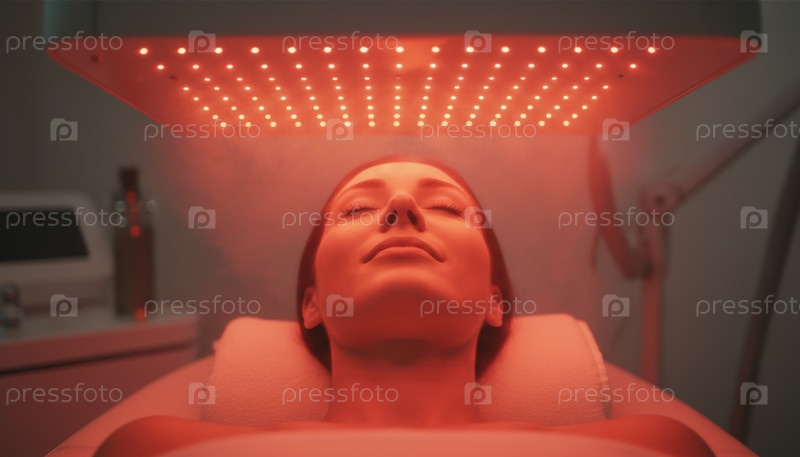 Сцена терапии красным светом показывает женщину, расслабляющуюся под светодиодной панелью в спа-салоне, символизирующей современный самообслуживание