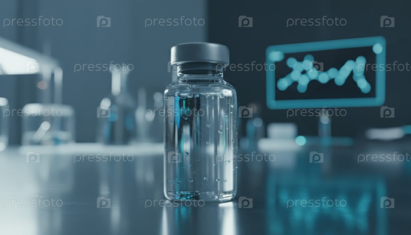 Стерильная стеклянная флакона на лабораторной скамейке из нержавеющей стали с цифровым монитором на заднем плане, предлагающая биотехнологические инновационные исследования вакцин и будущее высокотехнологичного здравоохранения