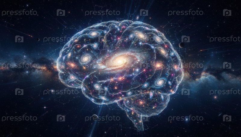 Космическая галактика, сформированная мозгом, иллюстрирующая науку воображения, инновационную творческую технологию мышления будущего, нейронные тенденции и перспективную исследовательскую концепцию