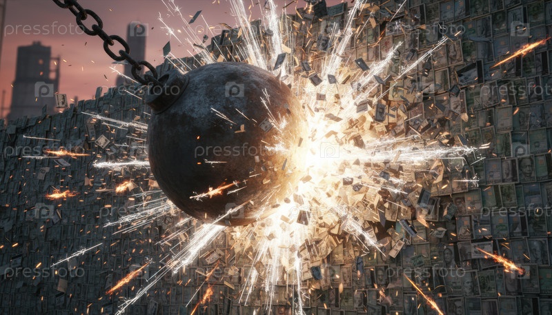 Деструктивный шар, взрывающийся через стену банкнот, символизирующих финансовый крах, разрушительные новости на рынке и глобальные экономические потрясения