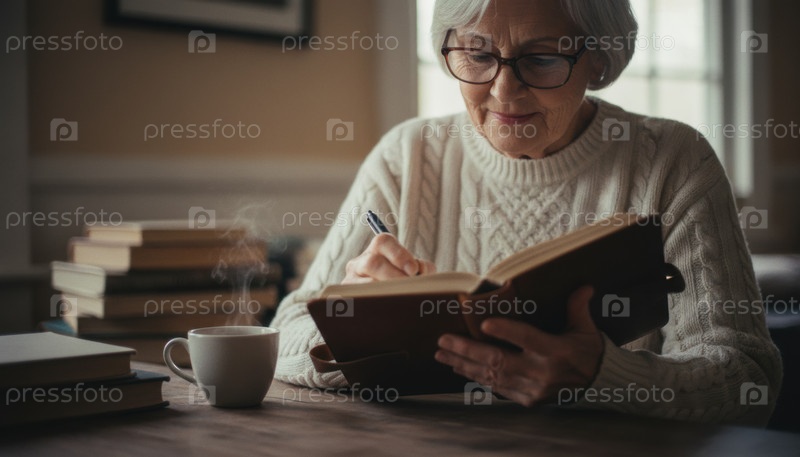 Пожилая женщина в очках пишет в кожаном журнале за деревянным столом с поднимающейся чашечкой кофе и кучей книг в уютной домашней библиотеке