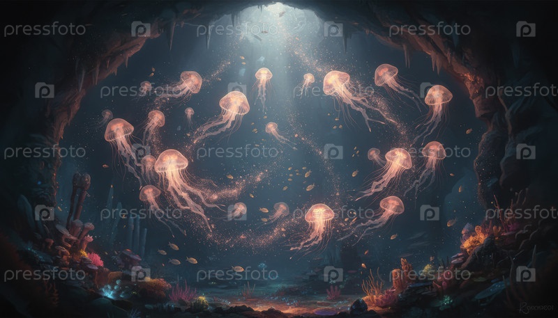 Волшебная подводная пещера, наполненная светящимися медузами, образующими сияющий круг, вызывает воображение морского чуда, фантастическую историю и творческое художественное исследование