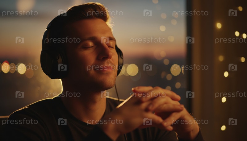 Расслабленный человек, слушающий музыку на закате солнца, представляет собой осознание цифрового благополучия личного бегства и современного образа жизни в вечерней обстановке