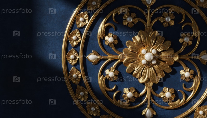 Закрывает сложный золотой круглый цветочный медальон с жемчужинными акцентами и заметным центральным цветком на богатом темно-синем бархатном фоне под драматическим светом