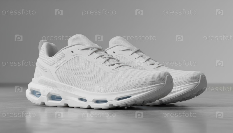 Пары хрустящих мягких белых облаков танцоров цвета кроссовки с футуристическим сегментированным дизайном освещаются на прохладной отражающей бетонной поверхности на простом сером фоне