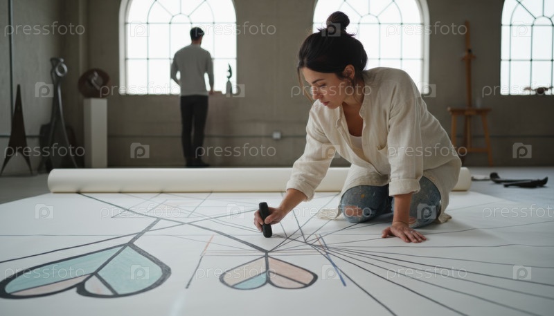 Художник создает большую геометрическую иллюстрацию, символизирующую творческое сотрудничество и развивающуюся роль визуального повествования в современной культуре