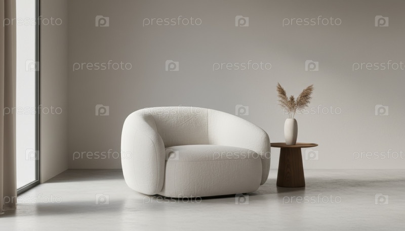 Модернистский минималистический белый стул сидит в спокойной солнечной комнате рядом с деревянным столом с декоративной сухой травой пампаса
