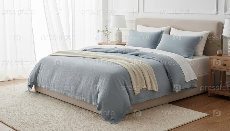 Спокойная нейтральная спальня с бледным мягким теплым белым светлым постельным бельем из натурального дерева и нежным окружающим светом, создавая безмятежное пространство для внутреннего отдыха