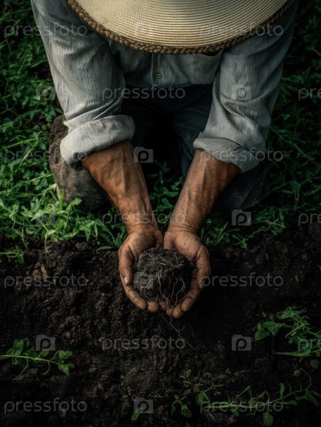 Руки фермеров являются колыбелью свежих саженцев в богатой почве, символизируя устойчивое сельское хозяйство, сезон посадки и помощь окружающей среде на селе