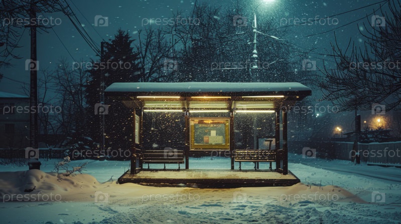 Тихое пригородное автобусное укрытие во время снегопада ночью, подходящее для тем городского уединения, атмосферного повествования о путешествиях и мрачной зимней фотографии