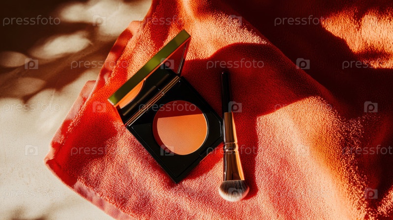 Luxury make-up flat lay с красной компактной и косметической щеткой на красной ткани, стилизованная как косметический брендинг и модная редакция