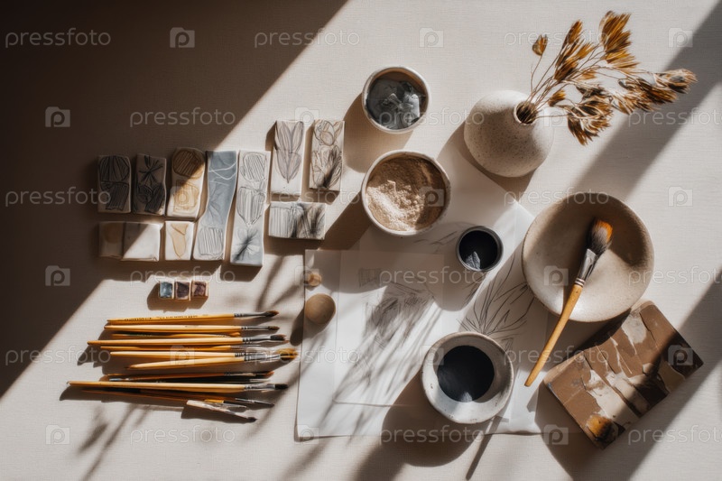 Рабочее место керамической живописи с тонкими кистями, глиняными инструментами и минималистичной студийной инсталляцией для творческого производства керамики