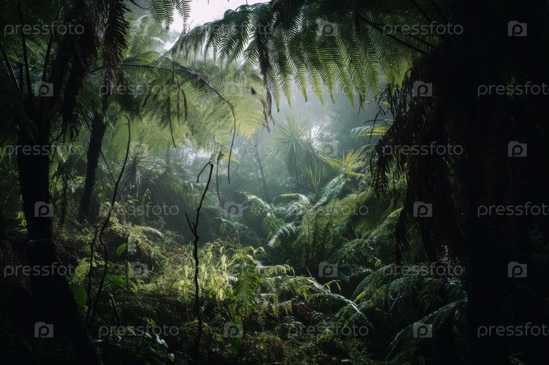 Густой туманный тропический лес, плотный доисторическими папоротниками и дикой флорой, вызывающий нетронутую природу, первобытную растительную жизнь и глубокую атмосферу тропической дикой природы