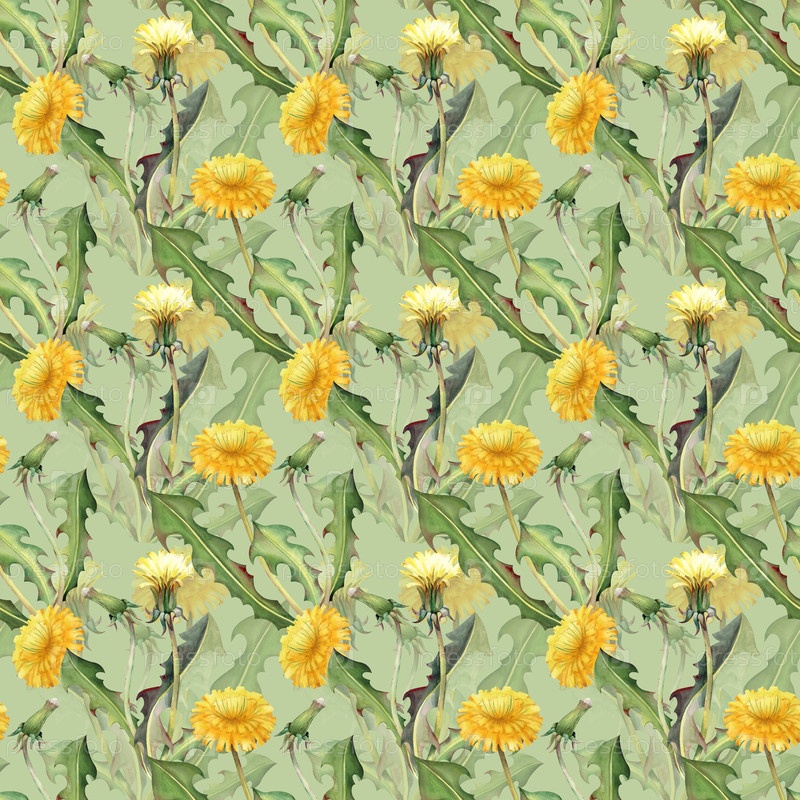 Акварельный бесшовный рисунок с желтыми цветами одуванчика, почками и зелеными листьями на светло-зеленом фоне, ручной живописи