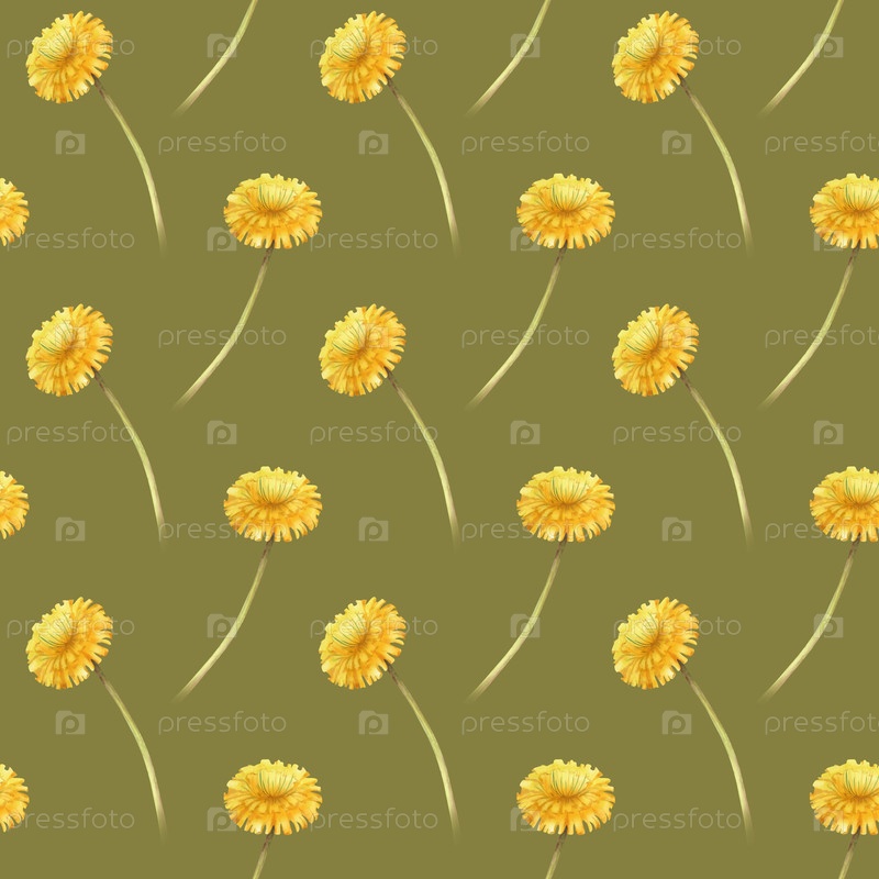 Акварельный бесшовный рисунок с желтыми цветами одуванчика на длинном стебле на зеленом фоне, написан вручную. ботанический безшифровый шаблон для обоев, упаковки, текстиля и посуды
