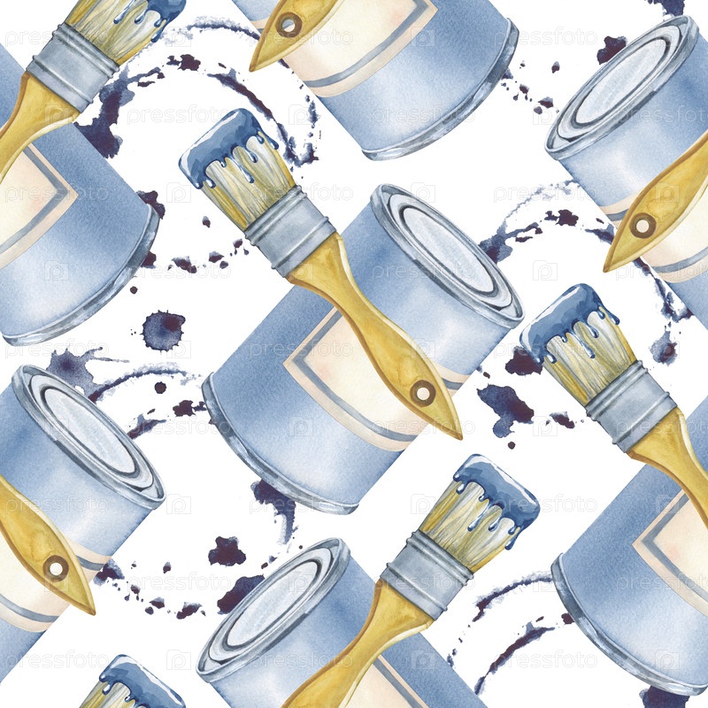 Бесшовный рисунок с баночками краски, кистью и пятнами синей краски на изолированном фоне. Иллюстрация акварели с рабочими инструментами для ремонта в натуральных цветах. Реалистичный фон для обоев, упаковки и печати