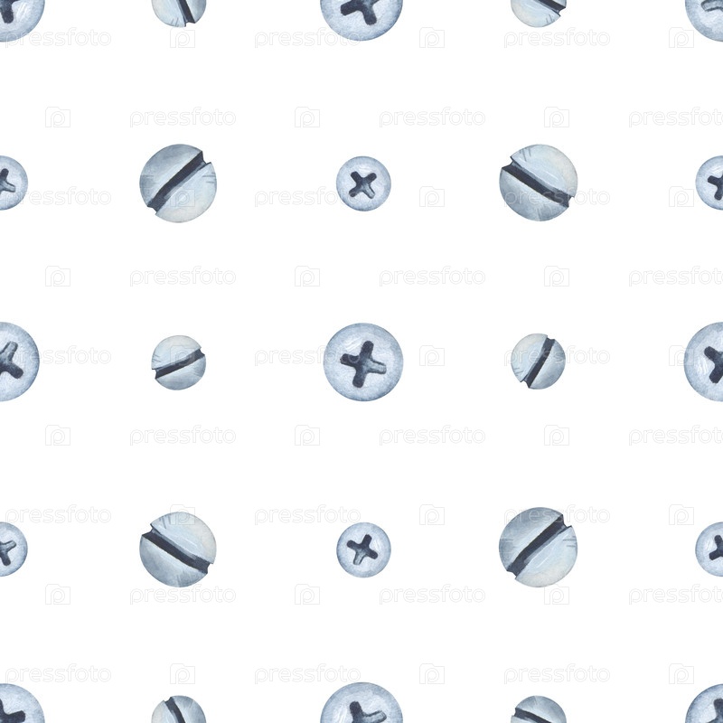Акварельный бесшовный рисунок с металлическими крышками винтов и болтов на изолированном фоне. Иллюстрация реалистичных рабочих инструментов в натуральных цветах. Шаблон для упаковки и регистрации строительного бизнеса