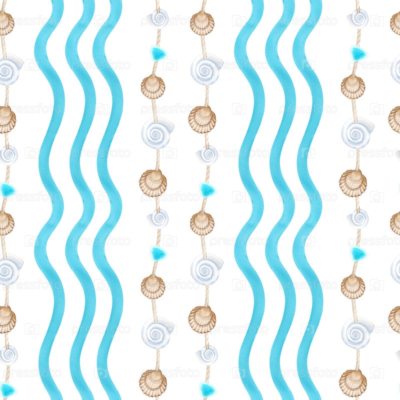Бесшовный рисунок с раковинами на ютовой веревке и стилизованными бирюзовыми волнами. Иллюстрация акварельной краски на изолированном фоне. Бесшовный фон в море, пляжный стиль