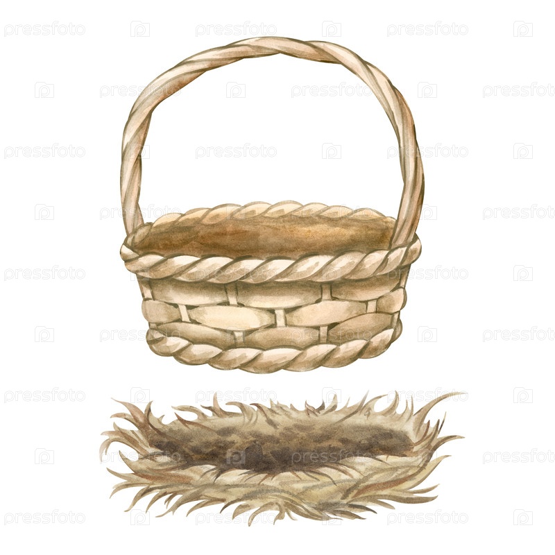 Монохромный набор пустых плетеных корзин с ручкой и круглым птичьим гнездом. Илюстрация акварели бежевым цветом на изолированном фоне. Реалистичный клипарт в натуральных цветах для деревни и пасхальных праздников